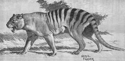 "Il était couché dans les hautes herbes et était aussi gros qu'un chien indigène [dingo] ; sa face était arrondie comme celle d'un chat, il avait une longue queue, et son corps était rayé depuis les côtes, sous le ventre, de jaune et de noir. Mon chien fonça sur lui, mais la bête put le terrasser. Quand ils furent ensemble je fis feu avec mon pistolet sur sa tête ; le sang jaillit. L'animal grimpa alors sur un arbre incliné, et le chien aboya après lui. L'animal devint alors féroce et sauta de l'arbre en fonçant vers le chien puis vers moi. Je pris peur et rentrai chez moi." (d'après Sheridan 1871).