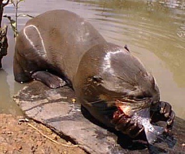 - On a également proposé que ces observations de carnivores aquatiques se rapportent à la loutre géante du Brésil (Pteronura brasiliensis) (figure 2) ou à une espèce de loutre encore inconnue (Mackal 1980). Mais la loutre géante du Brésil ne saurait terroriser que des poissons, et une loutre, même inconnue, armée de dents en sabre, et capable de mettre en pièces un jeune garçon, est tout simplement invraisemblable.