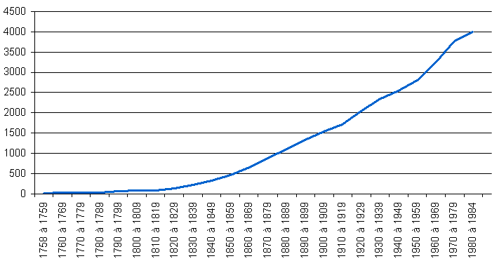 L'inventaire des batraciens depuis Linné en 1758 jusqu'en 1984 (d'après les données de Frost 1985) fait apparaître une progression assez constante du nombre d'espèces connues depuis 1830 environ (figure 1), démontrant que l'inventaire de cette classe de vertébrés est loin d'être terminé.