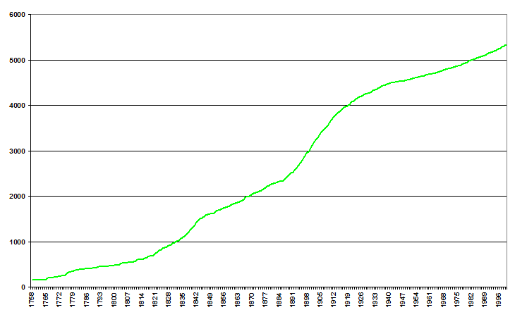 En prenant comme référence ce dernier comptage, espèce par espèce, des 5416 "bonnes espèces" de mammifères connues en 2003 (dont 5337 décrites jusqu'en 2000), listées dans l'ouvrage de référence Mammal species of the world (Wilson & Reeder 2005), on constate que l'évolution du nombre de bonnes espèces décrites en fonction du temps fait bien sûr apparaître une courbe strictement croissante, comme on l'a dit précédemment (figure 1) :