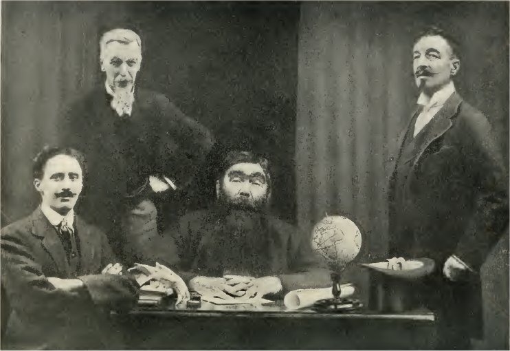 Challenger fait état de ses découvertes lors d'une conférence de l'institut de zoologie, où il est traité d'affabulateur, ce qui manque de faire dégénérer la réunion en bagarre générale. Finalement, il est décidé d'organiser une expédition sur place, pour vérifier ses dires. Y participent le professeur Challenger, bien sûr ; le professeur Summerlee, son principal contradicteur ; le journaliste Malone, pour couvrir les péripéties pour le public britannique ; et un aventurier chasseur de gros gibier, lord John Roxton (figure 4).