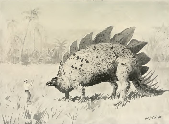 Malone demande alors à son directeur de lui confier une enquête journalistique périlleuse, qui lui permette de trouver grâce aux yeux de sa dulcinée. Rien ne semble plus dangereux au patron de la Daily Gazette que d'envoyer son collaborateur interviewer le professeur George Edward Challenger, un scientifique connu pour ses emportements contre ses confrères et contre les journalistes, dont il a copieusement rossé plusieurs représentants. Après une entrée en matière mouvementée, marquée par un inévitable pugilat, Challenger finit par éprouver quelque estime pour le jeune journaliste, à qui il va raconter une histoire extraordinaire. Lors d'une expédition effectuée deux ans auparavant en Amérique du Sud, Challenger a été appelé par les Indiens au chevet d'un Américain du nom délicieux de Maple White (littéralement "blanc d'érable", autrement dit "sucre d'érable", mais qui est aussi, certainement, un jeu de mots avec l'expression "white on the map", un blanc sur la carte, qui désigne une région inexplorée, ce qui se justifie pleinement puisque Challenger va trouver une carte de ces contrées inconnues faite par cet Américain). Hélas, Maple White est en fait déjà décédé peu avant l'arrivée de Challenger, mais ce dernier peut récupérer le sac et l'album de dessins du défunt. Ce dernier montre des paysages et des animaux de la région, dessinés d'après nature par l'infortuné américain, comme des tortues, des alligators, un lamantin, un agouti, etc. Mais il y a aussi un dessin d'un animal extraordinaire (figure 3) :