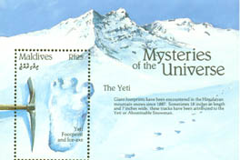 Les Maldives ont également imprimé une série de timbres ayant pour thème les "mystères de l'univers", réels ou supposés (OVNI, pistes de Nazca, etc.). L'un d'eux montre un dessin d'une empreinte de pas de yeti, visiblement inspiré des empreintes (d'ailleurs très controversées), relevées au Népal en 1951 par l'alpiniste américain Eric Shipton (figure 10). L'autre est un dessin de l'incontournable "monstre" du Loch Ness (figure 11).