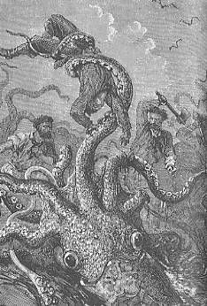 Jules Verne croit que les termes de calmar et de poulpe sont interchangeables, alors qu'ils désignent deux ordres bien distincts de céphalopodes. L'illustrateur de Neuville n'a fait que traduire en images cette confusion, puisque le monstre est tantôt représenté comme un poulpe (figure 4), tantôt comme un calmar reconnaissable notamment à ses tentacules spatulés (figure 6).