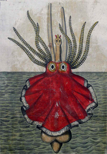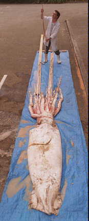 Échouée en 1673 sur une plage d'Irlande, la bête de Dingle-i-Cosh (figure 1), qui fit l'objet de spectacles forains en Grande-Bretagne, était sans conteste un calmar géant, dont le siphon a été pris pour une deuxième tête. On reconnaît notamment les 8 bras, les deux tentacules plus longs et dépourvus de ventouses, et la couleur rouge brique fréquemment rencontrée chez les Architeuthis morts.