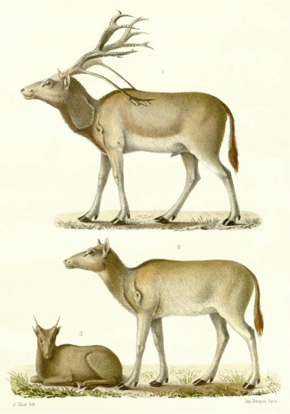 "M. de Bellonnet, notre chargé d'affaires, qui, à ma demande avait fait des démarches auprès des ministres chinois pour en obtenir du parc impérial, vient aussi de m'annoncer qu'on lui en promet deux en vie. Les deux rennes que j'ai rapportés moi-même hier sont une femelle adulte et un mâle de deux ans qui n'a qu'une seule dague pour tout bois ; mais sous peu de jours on me portera des bois de vieux mâles que je vous enverrai aussi. Nos rennes sont tous désarmés maintenant, leurs énormes bois trifides et tri-pectinés étant tombés il y a peu de jours, à la fin de décembre surtout. Ces animaux sont de la taille d'un gros cerf, d'un gris jaunâtre ou roussâtre, avec une ligne noire longitudinale sur le dos et une autre sur le poitrail.