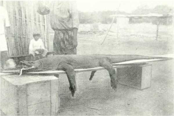 L'informateur du professeur Ouwens se rendit sur l'île de Komodo, où MM. Kock et Aldegon, deux pêcheurs de perles également amateurs de chasse, lui firent part de maints détails sur ces créatures :