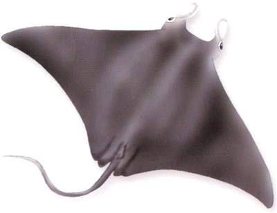 La raie manta est un énorme poisson (jusqu'à 6 mètres de large) presque plat, généralement noir sur le dos et blanc sur le ventre, aux larges nageoires pectorales et aux deux nageoires céphaliques en forme de lobes qui servent à l'animal à ramener la nourriture (du plancton) vers sa large gueule qui s'ouvre frontalement (et non ventralement comme chez les autres raies). Le corps se termine par une longue queue en forme de fouet, privée d'épine.