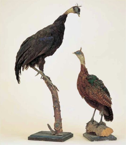 En fait, en 1914, alors que Chapin, encore en Afrique, venait juste de découvrir cette plume, le Musée du Congo belge à Tervueren (Belgique) recevait une collection d'oiseaux de la colonie belge. Deux d'entre eux (figure 2) furent naturalisés et étiquetés comme des paons ("Pavo cristatus, jeune, importé"), sans que personne ne s'avise de l'incongruité de cette identification.
