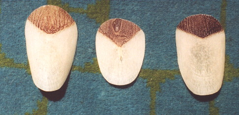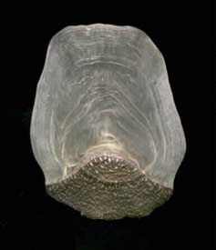 Figure 7 : écaille de cœlacanthe.J'avais donc classé ce dossier comme sans suite, lorsque je reçus des nouvelles sur une histoire similaire. Un de mes contacts, le naturaliste Roland Heu, trouva en 1992 dans une boutique de Biloxi (Mississippi) un récipient d'écailles non-identifiées. Les dimensions de ces écailles ovales sont de 4 à 5 cm de long et 3 à 4 cm de large (figure 8). Roland Heu les décrit ainsi :