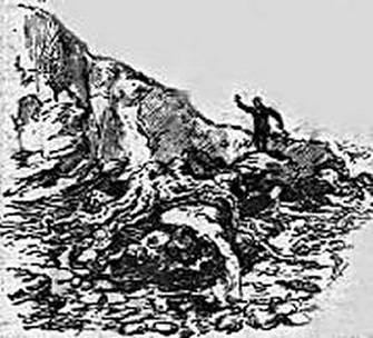 (illustration de la Yachting Gazette, 1899)"M. Fison, saisi d'horreur, cria, jeta des pierres aux affreuses bêtes. Alors doucement, ayant déroulé leurs tentacules, elles commencèrent à se mouvoir dans sa direction avec un ronronnement irrité. Il se sauva, trébucha, se releva. Après avoir fait une vingtaine de mètres, il regarda derrière lui. Le roc qu'il venait de quitter se hérissait déjà de lanières visqueuses. Alors, glissant, sautant, tombant, il se rua follement à travers flaques et galets jusqu'à la falaise où deux ouvriers le virent arriver, l'œil fou [figure 2]. Tous trois jetèrent des pierres aux bêtes, qui disparurent.