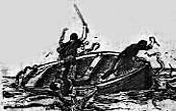 (illustration de la Yachting Gazette, 1899)"D'ailleurs, un cri terrible le fit retourner. Hills était accroupi près de la tolletière d'avant. Son bras droit avait complètement disparu dans l'eau, comme prisonnier. Il se crispa. Le bateau faillit chavirer. M. Fison se rejeta instinctivement sur l'autre bord. Mais Hills, qui était vigoureux et râblé, réussit à se relever presque entièrement. Son bras droit sortit de l'eau, enserré comme de lianes de chairs brunes et tendues. En même temps, un gros œil résolu parut au ras du bord. Ewan piqua avec sa gaffe. Mais déjà Hills retombait, les côtes sur le taquet. De nouveau tentacules s'abattirent sur son épaule et sur son cou. En un instant, il avait passé par-dessus bord. [et de deux...]