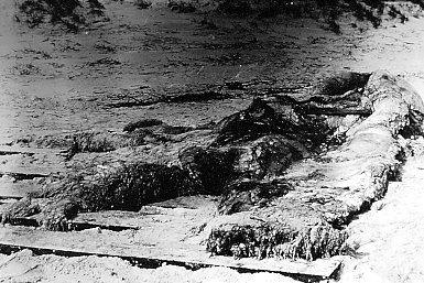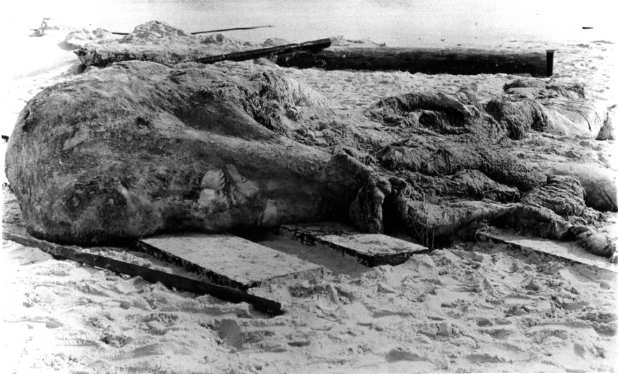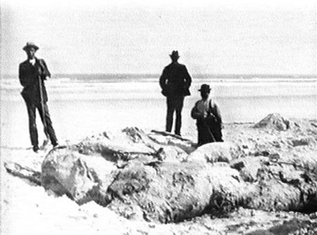 (photo Van Lockwood, archives Saint-Augustine Historical Society).Dans cette même lettre du 17 janvier 1897, le Dr. Webb disait aussi que la couverture musculaire, de 3 à 6 pouces d'épaisseur (7,5 à 15 cm), était formée extérieurement de fibres longitudinales, et intérieurement de fibres transversales. Surtout, Webb insistait sur l'absence de nageoire caudale, comme de "plume", qui eussent désigné le calmar, comme d'ailleurs l'absence de toute structure squelettique interne. Il ne trouva pas davantage trace des yeux, ni du bec, la région de la tête étant très mutilée. Enfin, insistant sur l'état de conservation excellent du cadavre, il priait les professeurs Dall et Verrill de se rendre eux-mêmes sur place. Hélas, comme devait l'expliquer Y.A. True dans une lettre au professeur Dall :