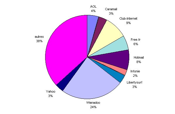 Commentaire : la catégorie "autres" regroupe les données inférieures à 2 %. La prédominance de Wanadoo, le fournisseur d'accès Internet de France Télécom, également présent en Belgique et en Espagne, s'explique évidemment par la place de leader de ce FAI en France, mais aussi sans doute par le fait que notre site est lui-même hébergé par Wanadoo, et bénéficie ainsi indirectement de l'audience du FAI.