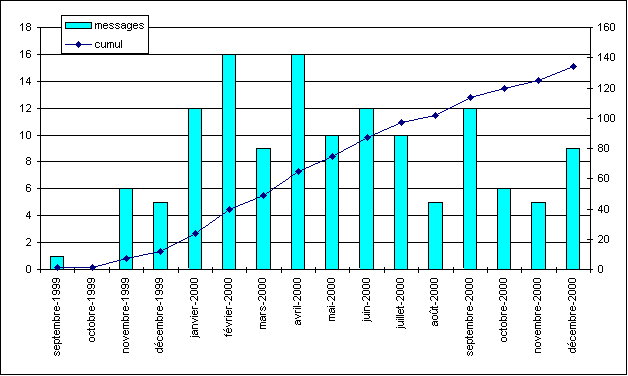 Commentaires : une moyenne d'une douzaine de messages par mois est diffusée depuis janvier 2000 (rappel : la liste est pour l'instant dédiée à l'information descendante).