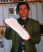 - des traces de pas (figure 2), qui ont fait l'objet d'études anatomiques et biomécaniques très approfondies, notamment par Grover S. Krantz, anthropologue. En particulier, certaines d'entre elles montrent la présence de dermatoglyphes (empreintes digitales et palmaires du pied), rendant une supercherie invraisemblable. Notons qu'il ne s'agit nullement de pieds humains de grande taille, puisque les traces (en tout cas celles qui résistent à l'examen) présentent des caractères anatomiques bien spécifiques : double thénar (l'éminence charnue à la base du gros orteil), allongement relatif du calcanéum, pied plat (absence de voûte plantaire), faible différenciation des orteils, etc.